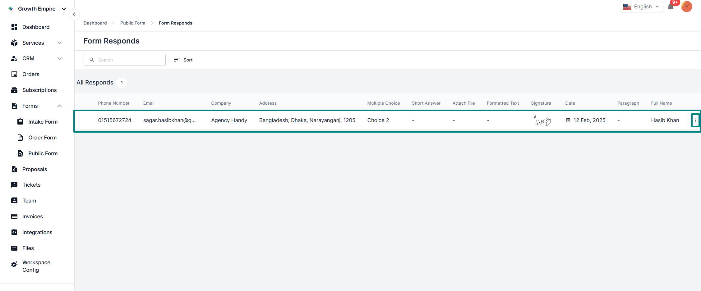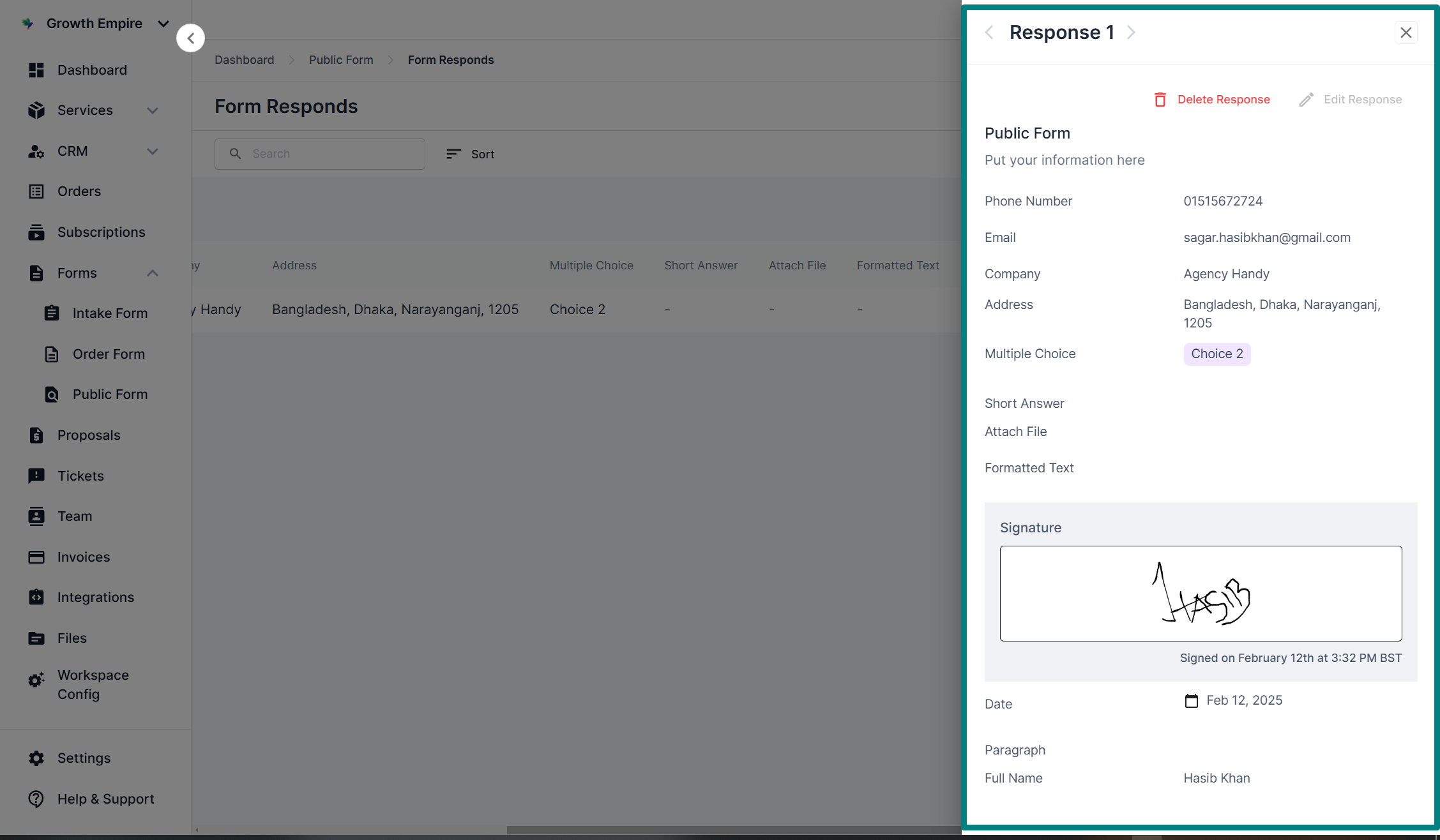 * All submitted responses are displayed accurately with options for detailed viewing, editing, and deletion.
