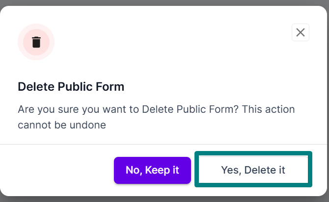 * A warning modal will pop up. Click the Delete button. Your Form will be deleted.<br>