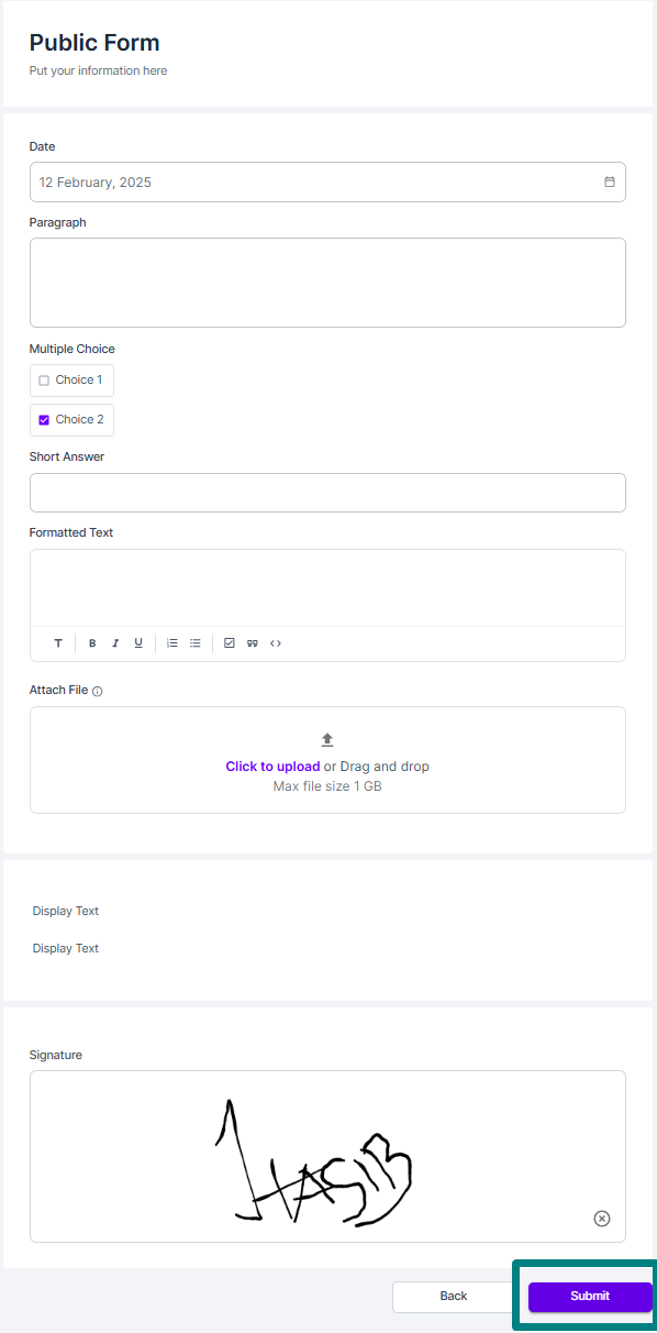 * Additional fields: Full Name, Phone Number, Email, Address, Company, Signature, and Terms & Conditions, **each are allowed only once.**