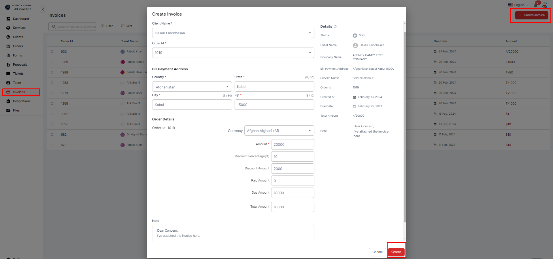 * **Send Invoice:** Once the invoice is finalized, send it to the client via email or other communication channels directly from AgencyHandy.&#x20;