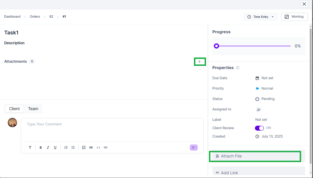 * Click the ➕ icon in the Attachments section or from the bottom right section