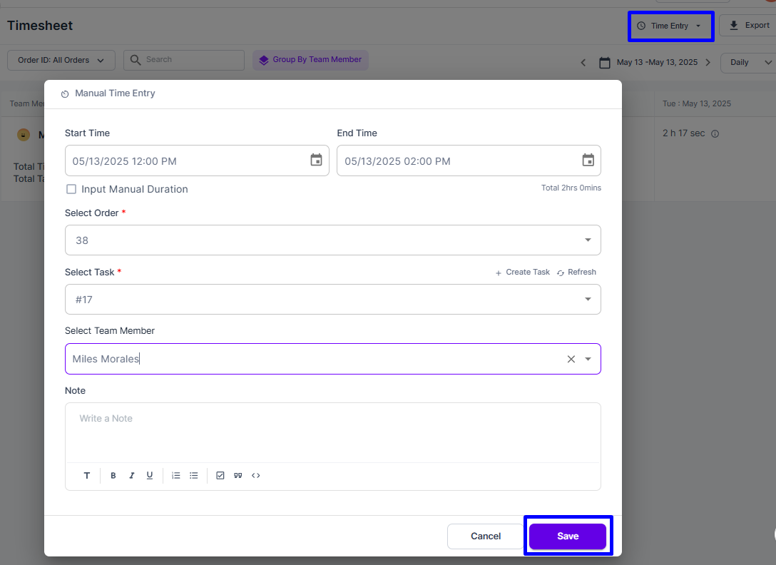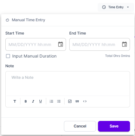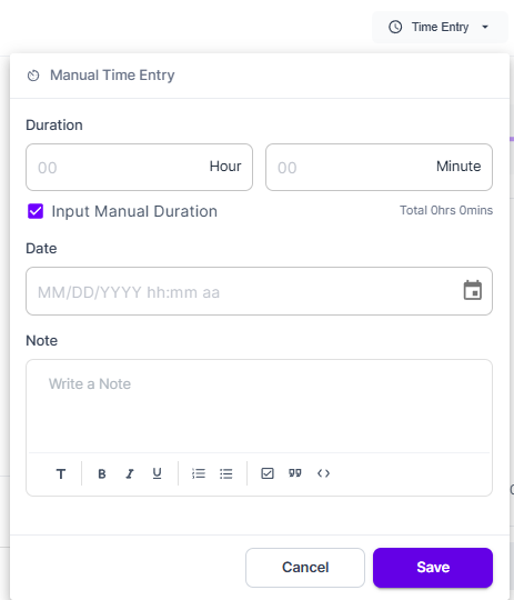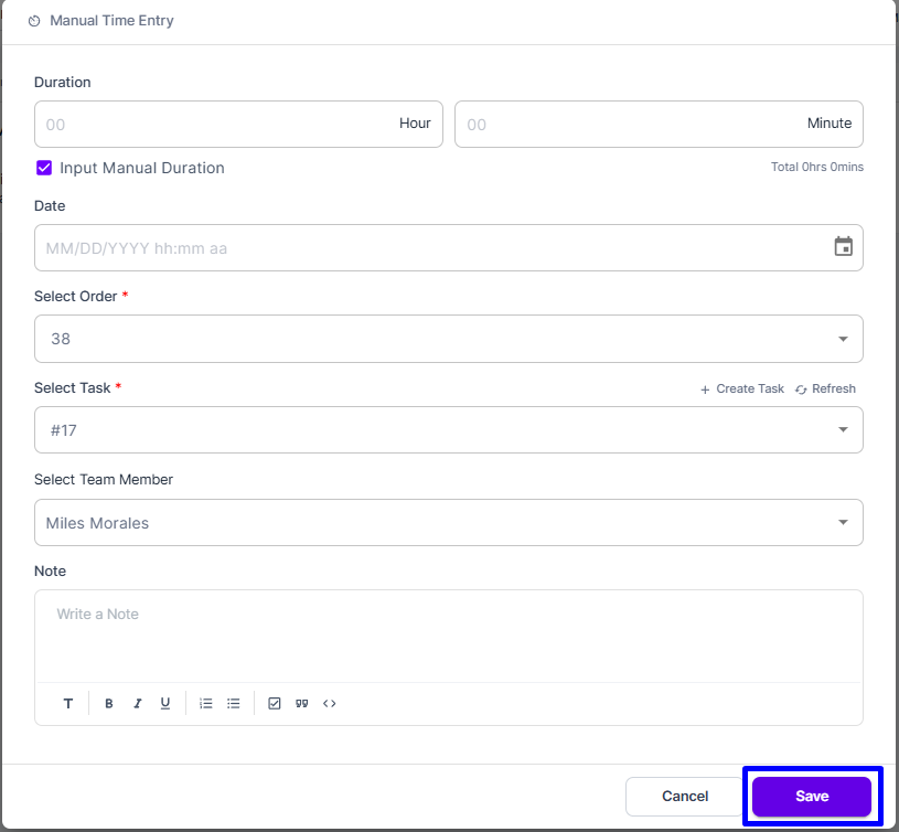 💡 *Admins and Superadmins can also add manual time entries for users. You can input the Manual Duration in Manual Entry.*
