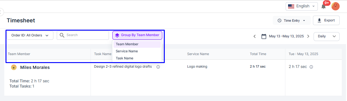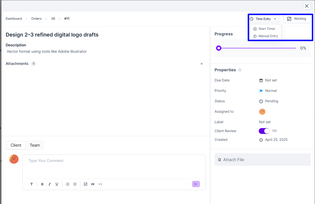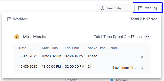 💡 *Multiple users can log time on the same task simultaneously.*&#x20;