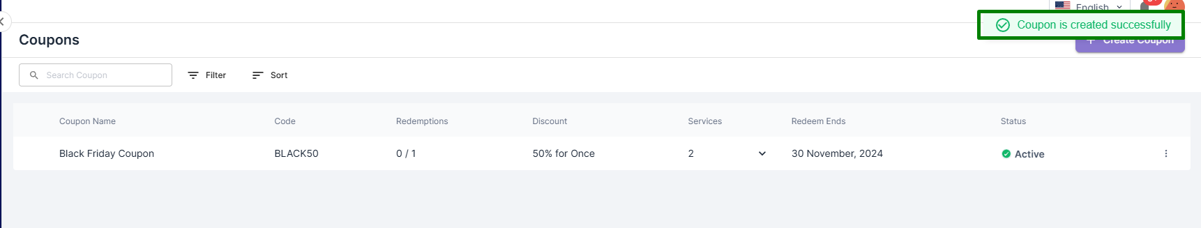 <figure><img src="https://842362573-files.gitbook.io/~/files/v0/b/gitbook-x-prod.appspot.com/o/spaces%2FiedbxyF6rrnGBuHuFME1%2Fuploads%2FRAeT7DKhTB9zmxocuM2S%2FScreenshot_9.png?alt=media&#x26;token=75192761-9413-473e-ba23-40499c6977e8" alt=""><figcaption><p>Coupon Code Created Successfully</p></figcaption></figure>