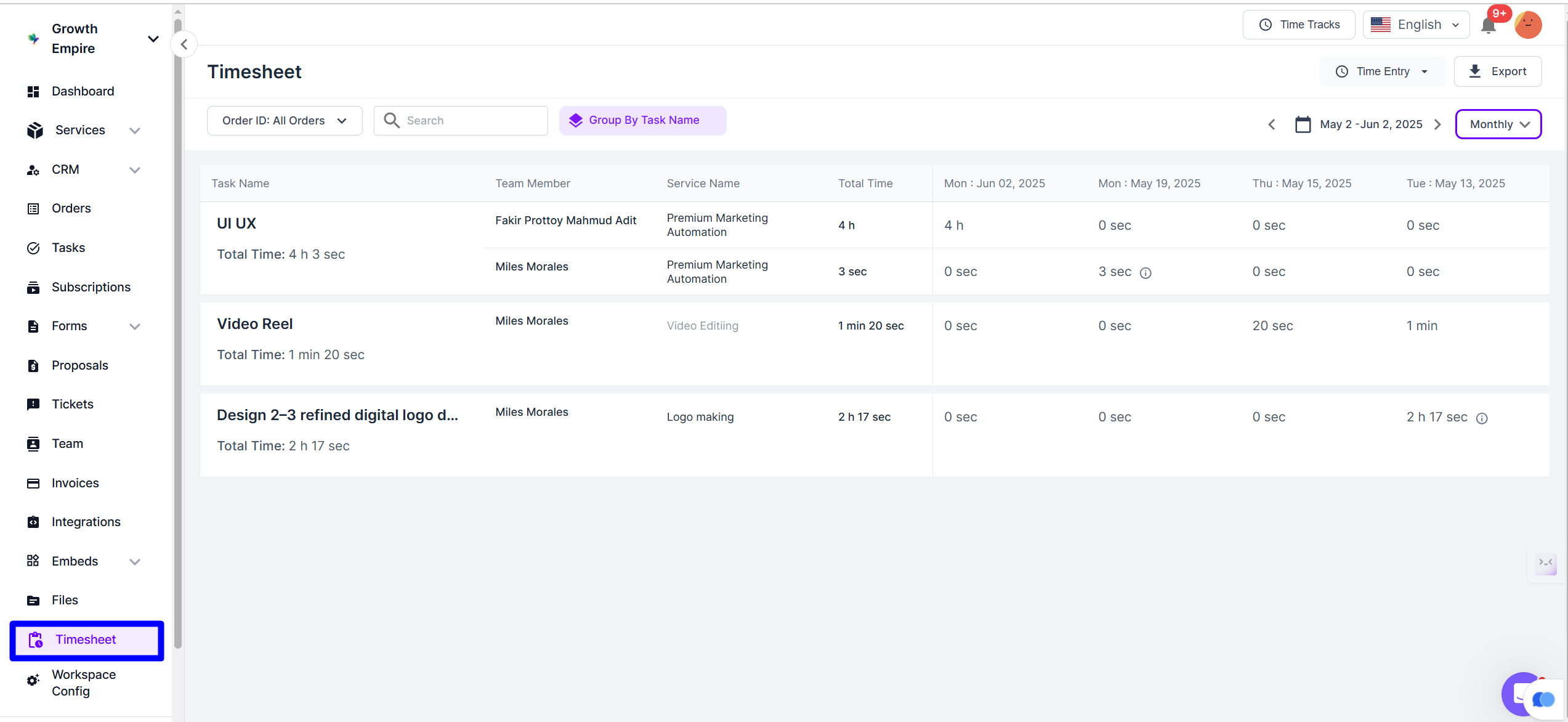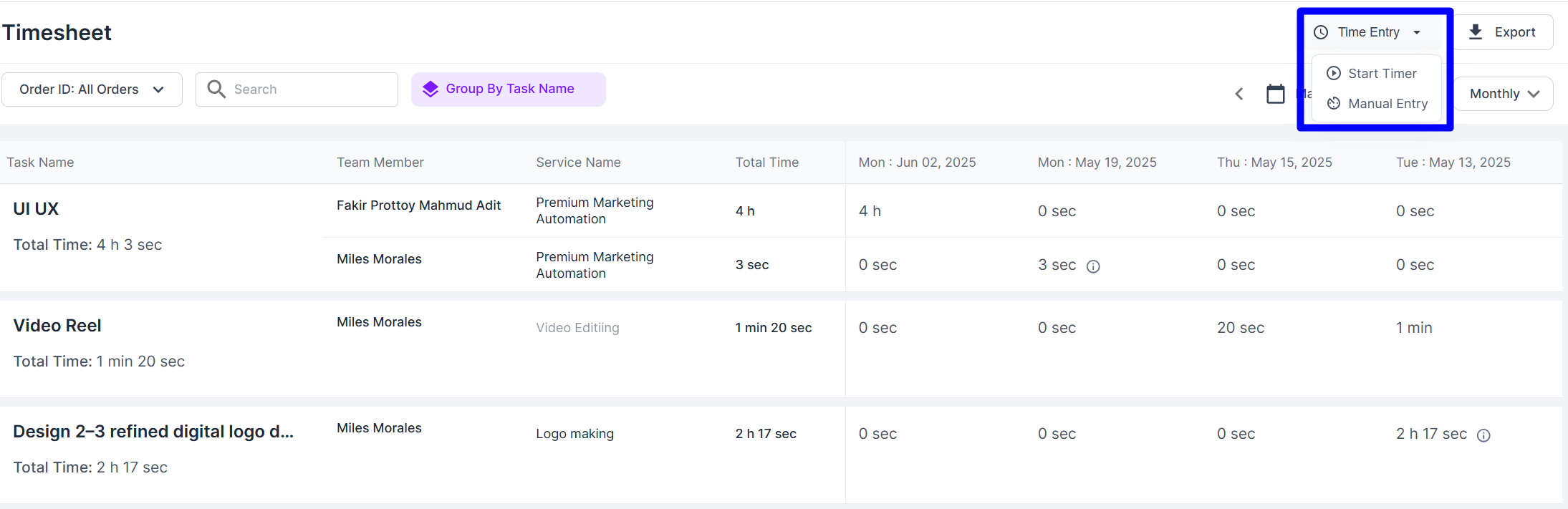 The **Timesheet** feature in Agency Handy helps you track the work logs of your agency team. From this panel, you can start a timer for any task, log time manually, and view logged hours by task, member, or service. You can also filter by date range, group entries, and export the data in CSV or XLSX format. It's an essential tool for monitoring productivity and generating time-based reports.