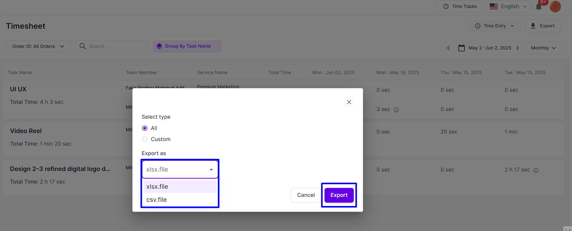 * Export timesheet data in CSV or XLSX formats.
