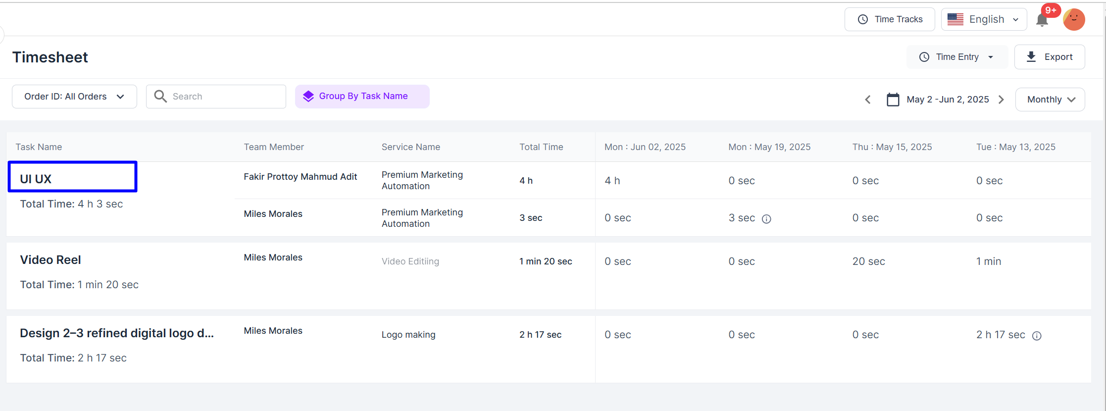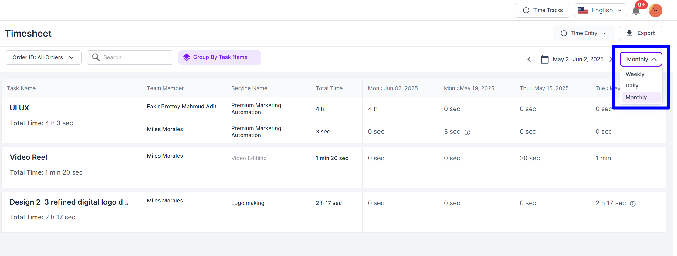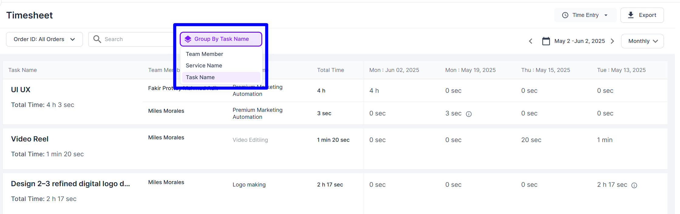 2. You’ll now see a table with all team time logs.