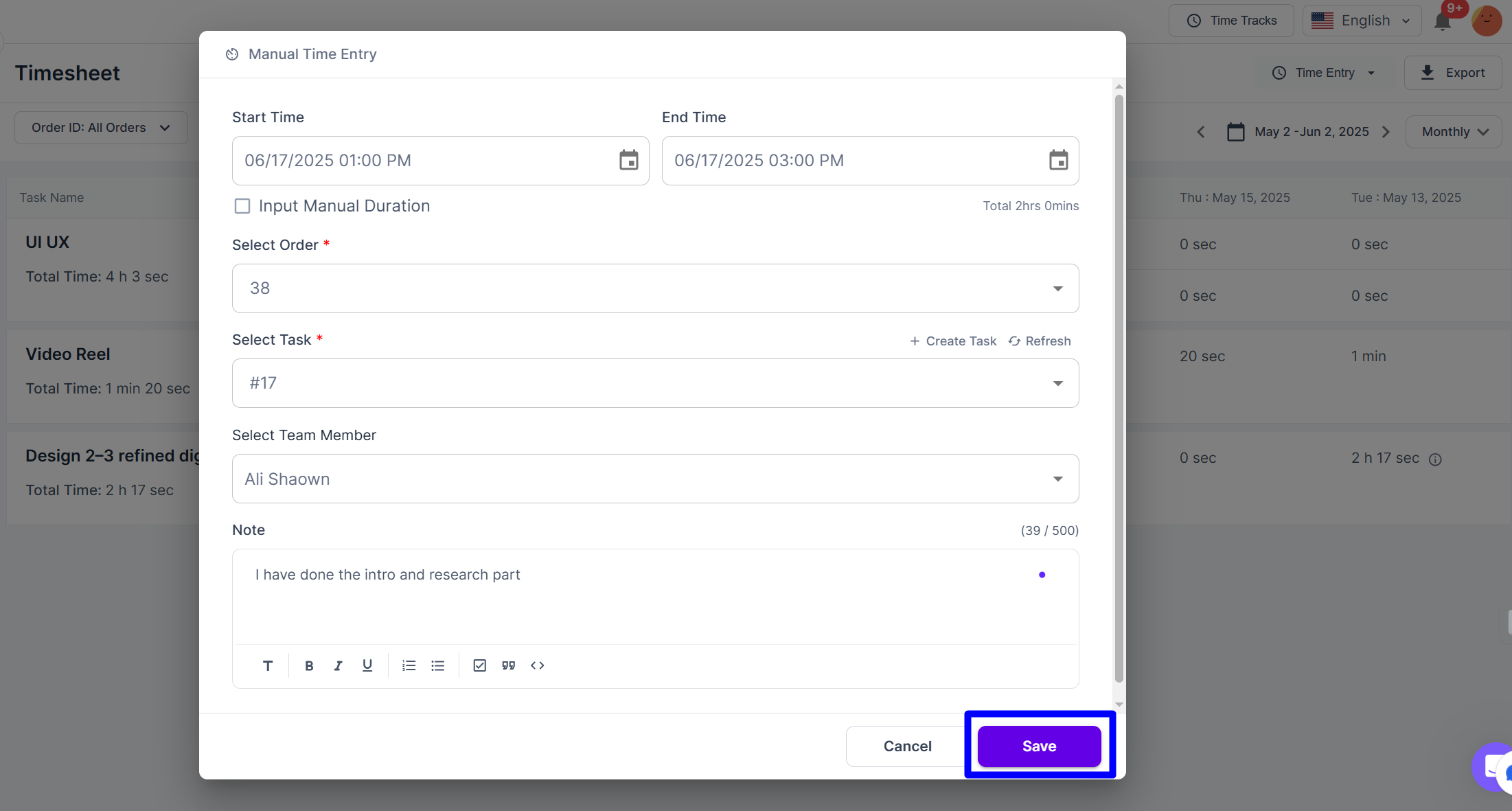 2. Choose the task, team member, time spent, and add notes if needed.