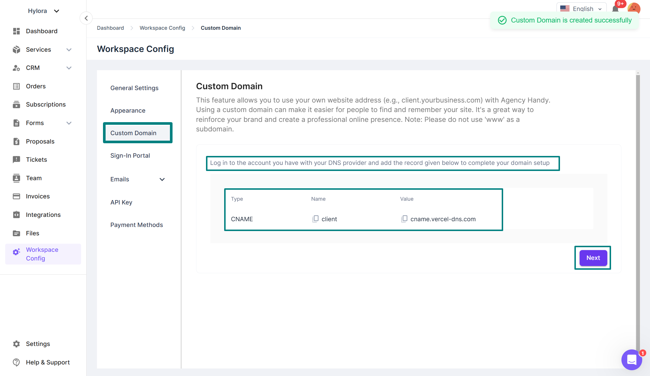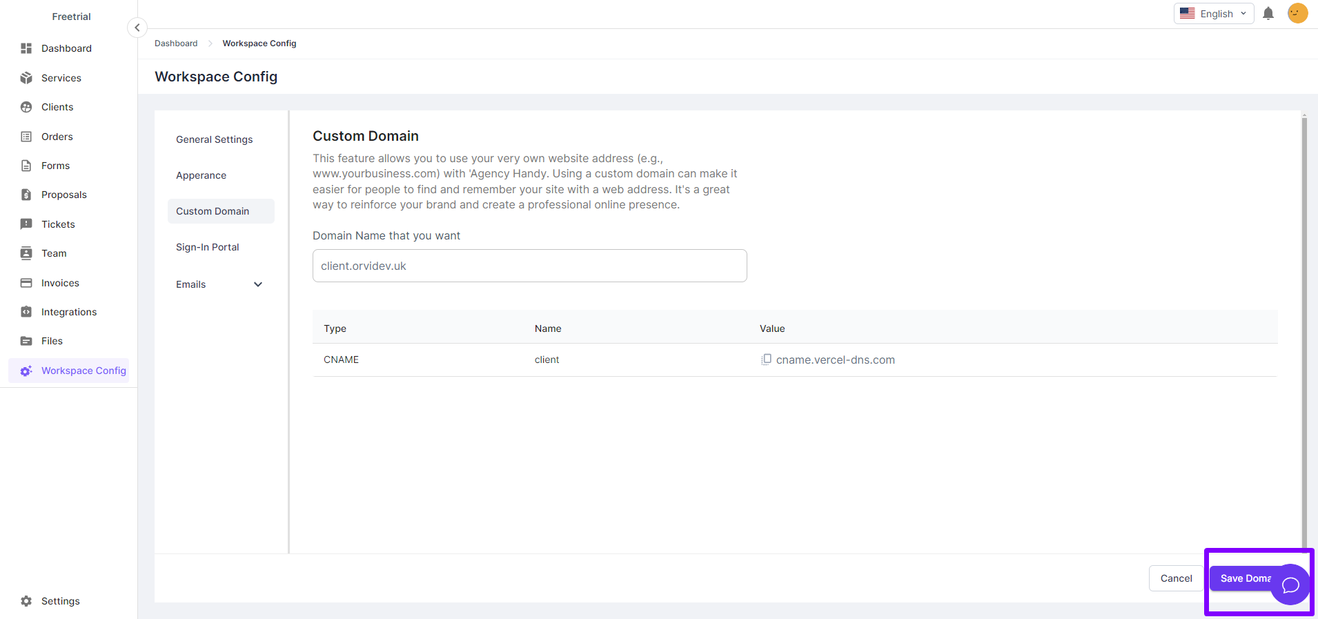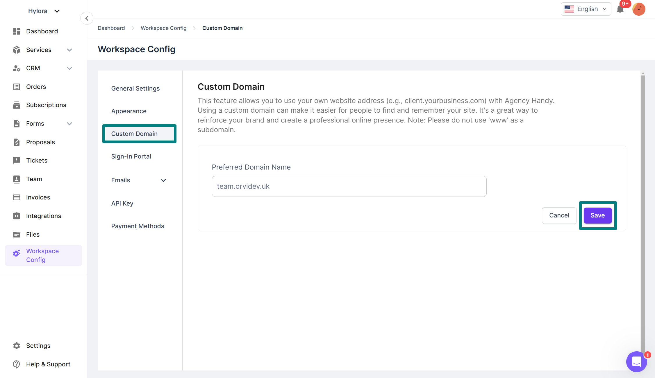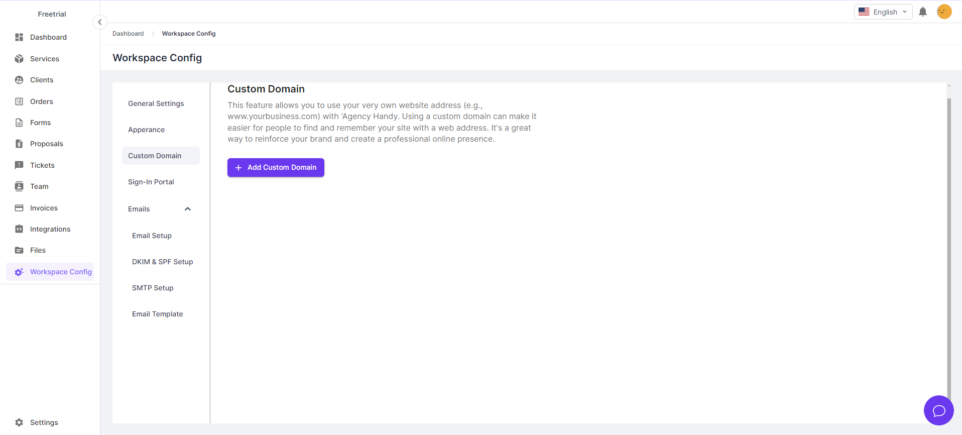 The **Custom Domain** feature in Agency Handy allows users to link their own domain (e.g., `client.yourbusiness.com`) to their workspace. This enables businesses to create a professional, branded experience and make the platform easily accessible to clients and internal users.