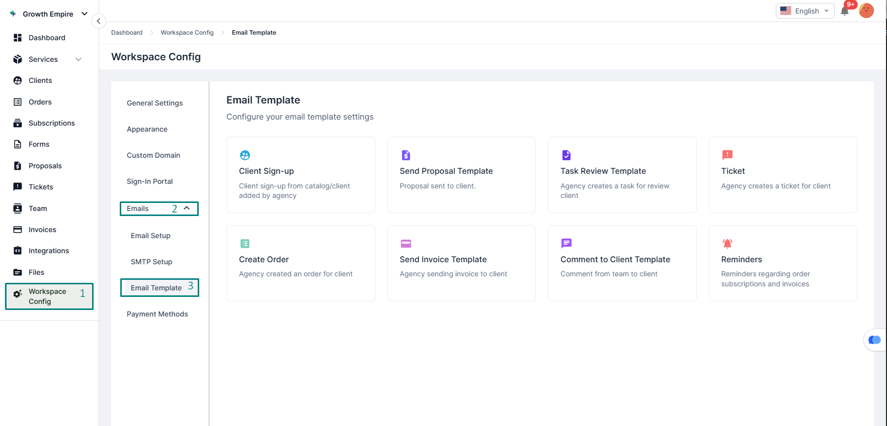 This feature enables agencies to set up and manage email templates for invoice reminders, subscription reminders, client notifications, and more.