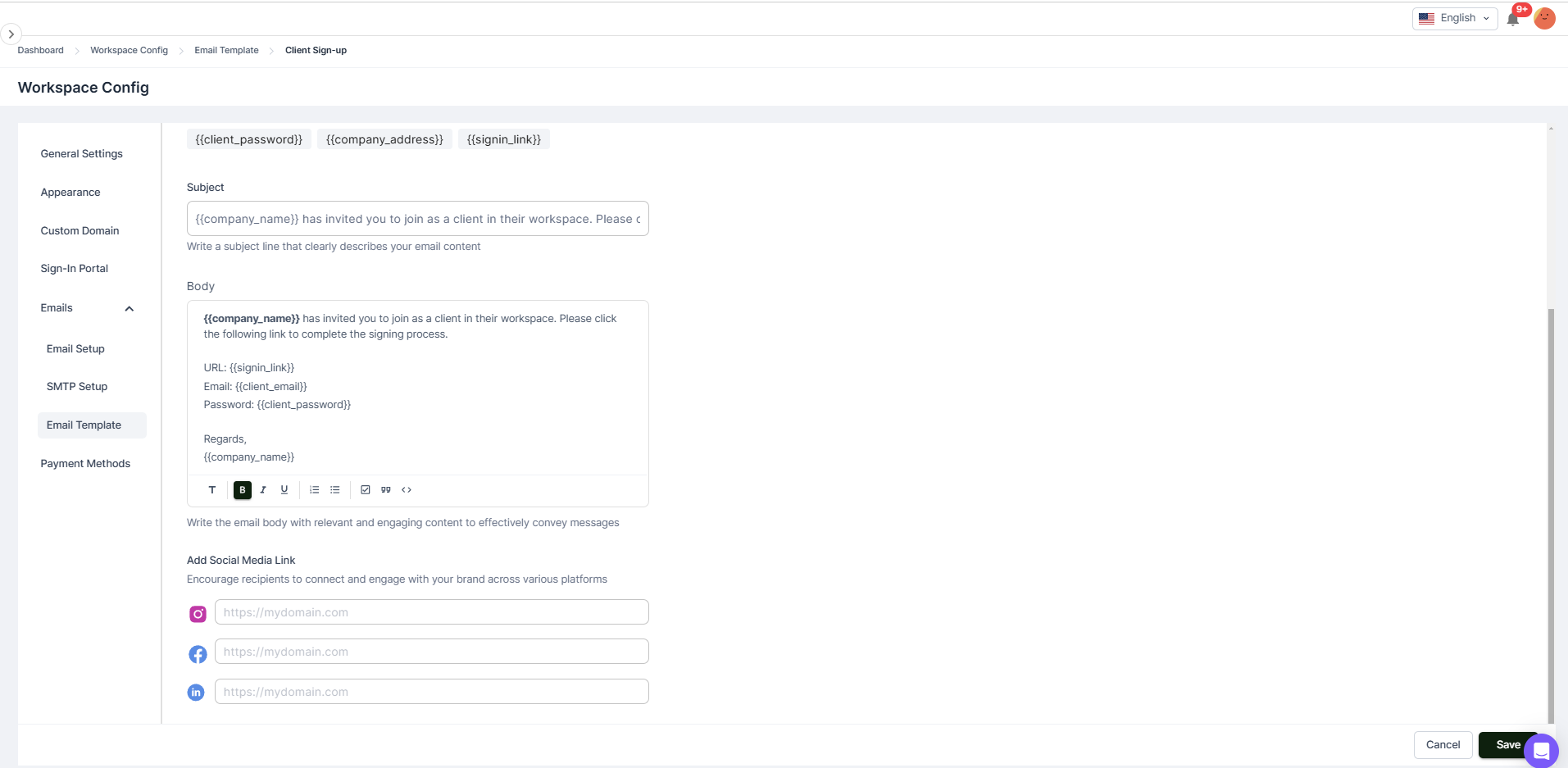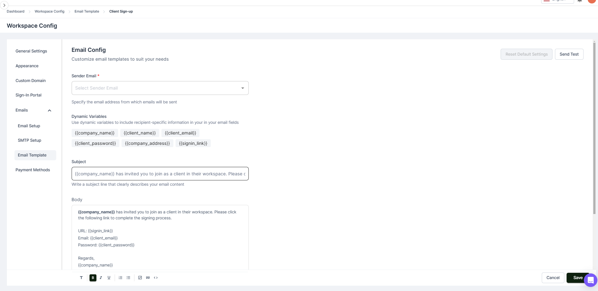 Dynamic Variables: Add placeholders like {{company_name}}, {{client_name}}, or {{invoice_id}} to personalize emails.