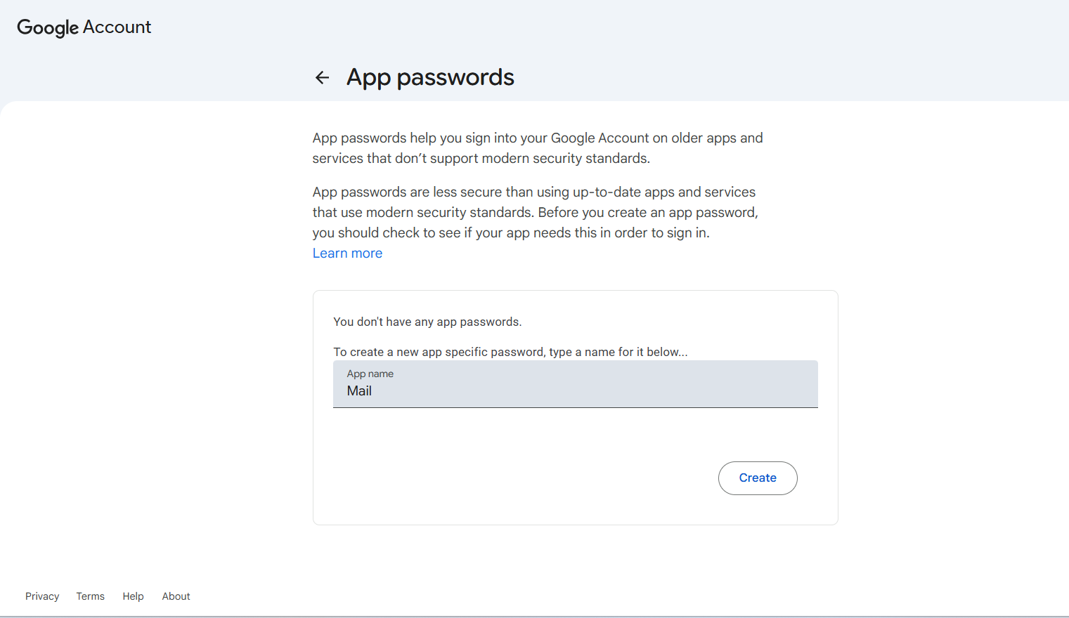 * Once 2-Step Verification is active, go back to the Security section or directly to <https://myaccount.google.com/apppasswords>.